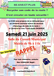 C’est pour cela que le CCAS de la commune vous propose de participer à plusieurs sessions de remise à niveau du code de la route, de manière ludique et conviviale ! Ces sessions de « Recyclage du Code de la Route Seniors » sont spécialement conçues pour vous.